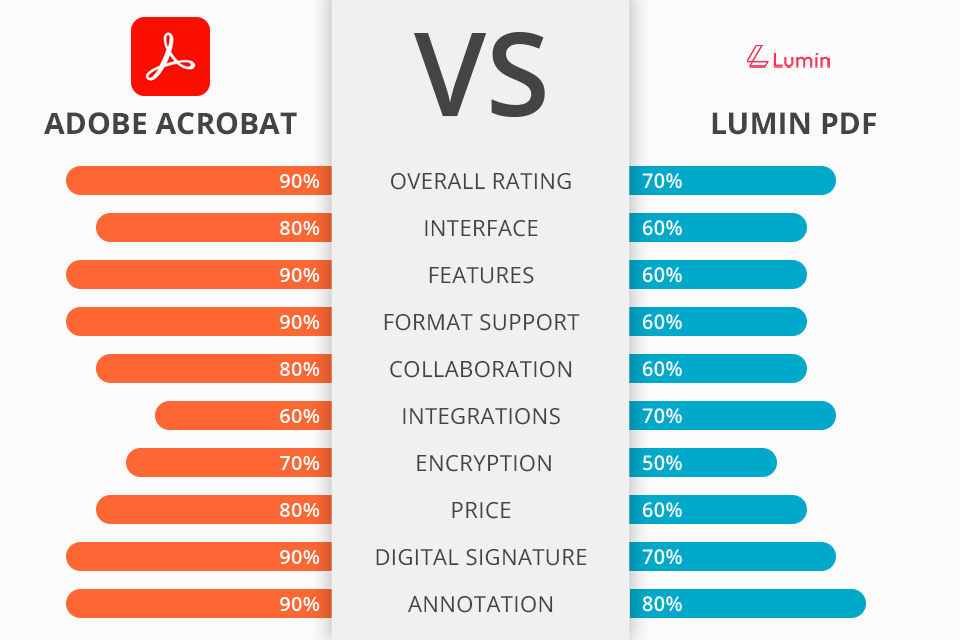 The Adobe Acrobat DC vs Lumin PDF comparison may interest those people, who are looking for feature-rich software for managing PDF files. While the Adobe program stands out with advanced features and top-tier protection protocols, its competitor makes the process of changing PDFs very easy without involving complicated manipulations.