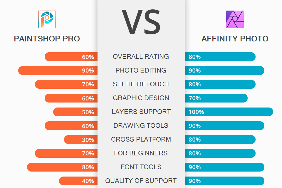 أثناء مقارنة PaintShop Pro مقابل Affinity Photo من أجل تحديد الخيار الأفضل لاحتياجات معينة ، من المهم الانتباه إلى ميزات كل برنامج. يحتوي كلا المنتجين على مجموعة جيدة من الأدوات لإنشاء مشاريع التصميم الجرافيكي ، وتحرير الصور ، وإضافة تأثيرات مختلفة إلى الصور.