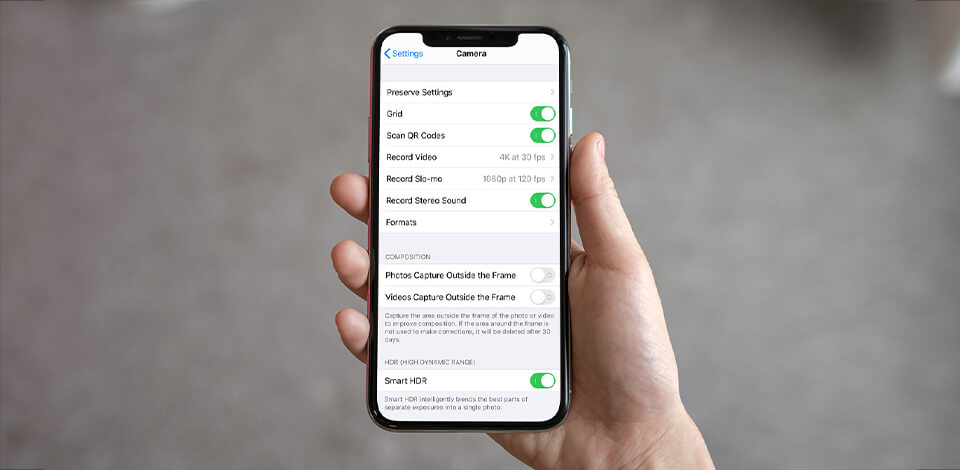 Some iPhone camera settings are available directly in the Camera app, while others can only be changed in iOS Settings. To access them, go to Settings and then to the Camera menu.