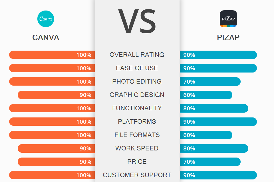 When comparing Canva vs piZap, you will see that both products have a basic set of editing features. piZap allows creating collages for cute memes and pictures. However, if you want a more professional editor, make sure to use Canva.