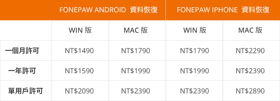 備註:一個月許可、一年許可和單用戶許可均適用於 6 台設備及 1 台電腦,在許可期內均可免費更新。