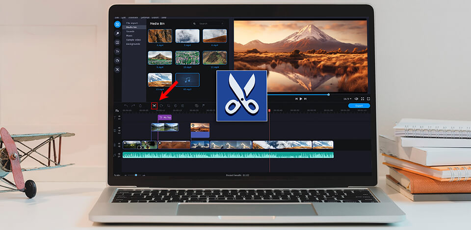 Una delle caratteristiche principali di Movavi Video Editor è la capacità di tagliare, eliminare, riorganizzare e dividere i clip senza sforzo. Tutto ciò che dovete fare è posizionare il marcatore rosso nel punto di taglio desiderato e fare clic sull'icona della forbice. È rapido ed efficiente.