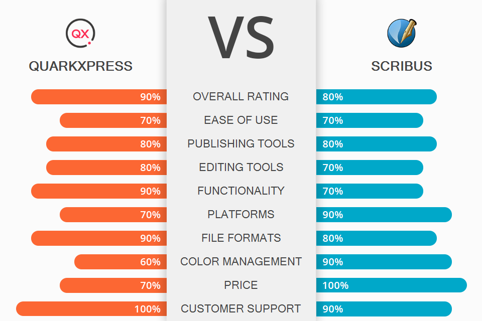 Comparing QuarkXPress vs Scribus is actually an interesting task because both programs have excellent features for creating newsletters, magazines, posters and other documents. However, Scribus can please users with all these goodies absolutely for free, while QuarkXPress allows testing its capabilities for free just several days, and then you need to switch to a paid version.