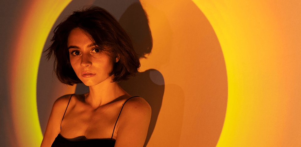 Highlight the mode’s face and eyes by putting the spotlight a little bit above them. This portrait photo idea is great for adding eye-catching shadows that focus the viewer’s gaze on the face. Tweak the light’s intensity to fine-tune the juxtaposition between shadows and highlights. A stronger light will make the effect more pronounced while a lower setting will add a softer look.